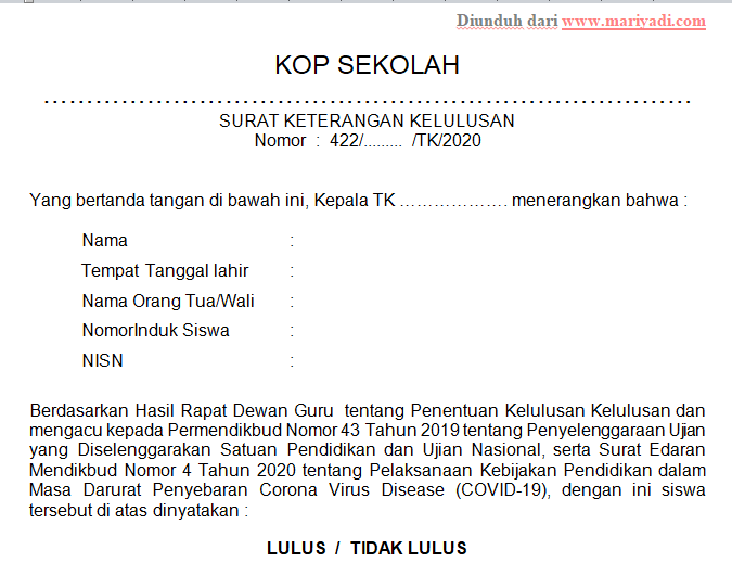 Contoh Surat Keterangan Lulus Tk Dan Paud 2020 Mariyadi Com