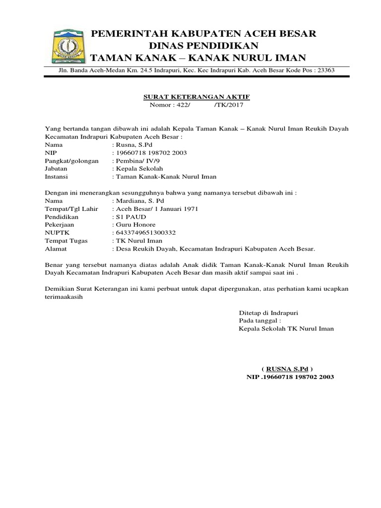 Contoh Surat Keterangan Aktif Peserta Didik Tk Paud 2018 Cpartikel