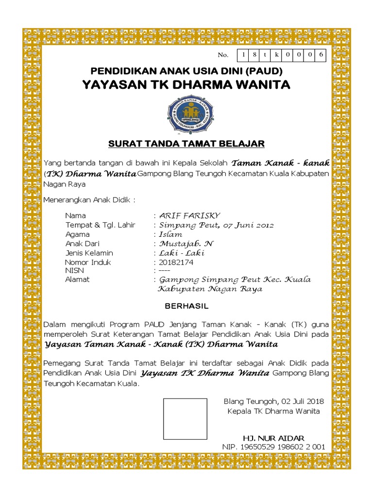 Contoh Surat Keterangan Lulus Paud Dan Taman Kanak Kanak