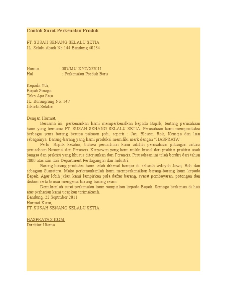 By surya_udayana92 in Types BusinessLaw Marketing perkenalan produk dan surat resmi. Contoh surat perkenalan Nah pada kesempatan kali ini saya akan membagikan pengetahuan mengenai beragam contoh surat perkenalan. Contoh Surat Perkenalan Full Block Style - Banyak perusahaan perusahaan besar yang dengan mudah memperkenalkan diri maupun memperkenalkan produk ke pihak lain yakni dengan cara memasang iklan.