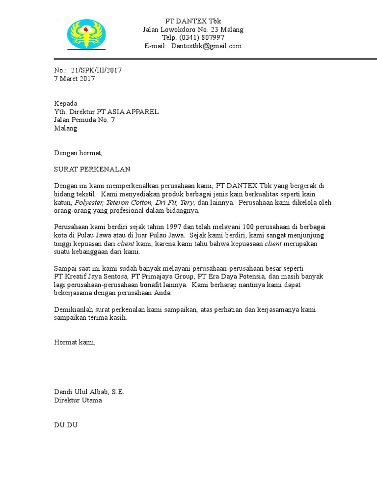 Pada zamam ini barang barang fashion sudah mulai banyak diminati apalagi fashion yang digandrungi oleh anak muda. Di bawah ini akan kami berikan beberapa contoh dari surat perkenalan perusahaan yang bisa anda jadikan acuan untuk nanti anda bisa membuat surat perkenalan perusahaan anda sendiri yang tentunya akan sangat menarik dan ampuh menarik pelanggan. Surat ini merupakan salah satu jenis surat niagaperdagangan yang termasuk dengan jenis surat yang.