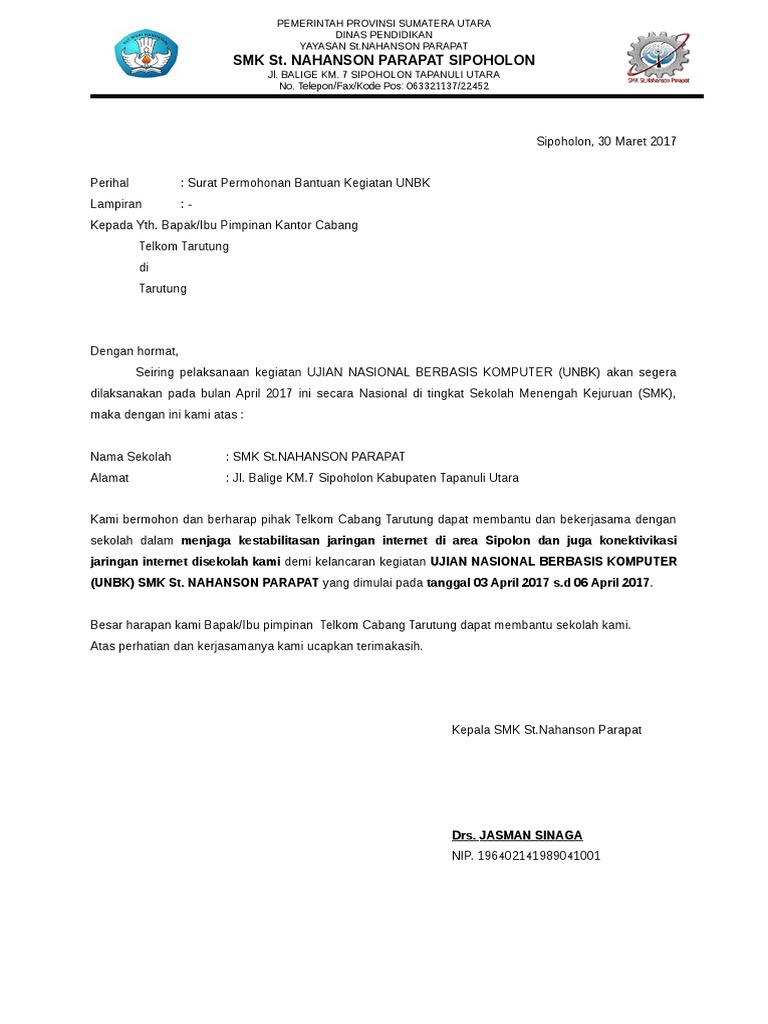 Contoh Surat Permohonan UNLOCK Pada UNBK. Lebak tahun 2014 maka kami mohon bantuannya untuk penerangan listrik tdak terjadi pemadaman listrik selama kegiatan FLS2N berlangsung adapun kegiatan tersebut dilaksanakan pada Wassalamualaikum Wr. NAHANSON PARAPAT SIPOHOLON Jl.