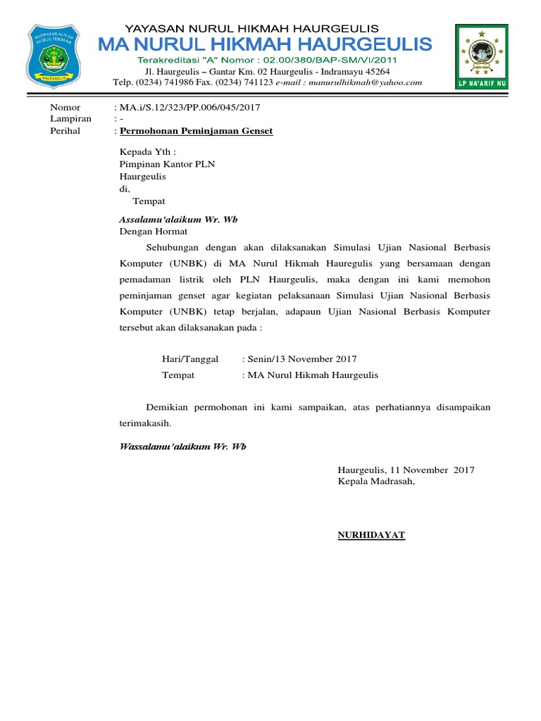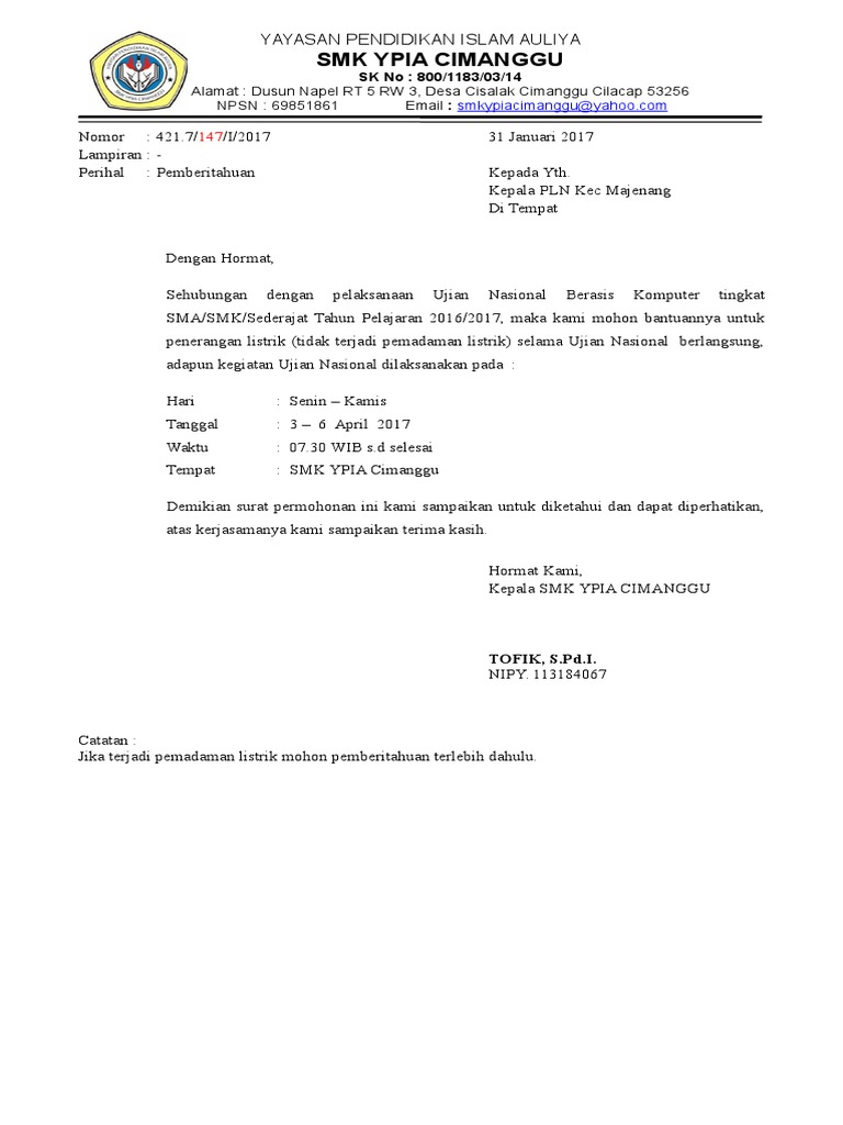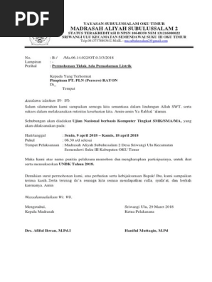 Contoh Surat Permohonan Ke Pln Untuk Unbk