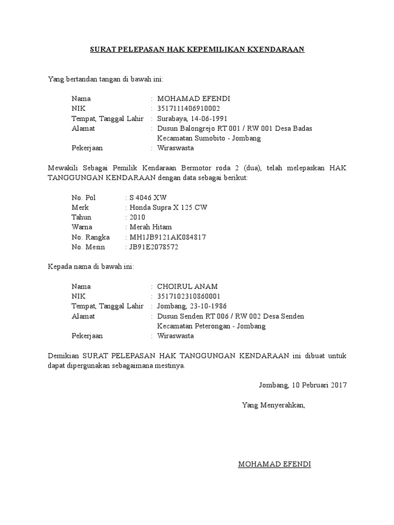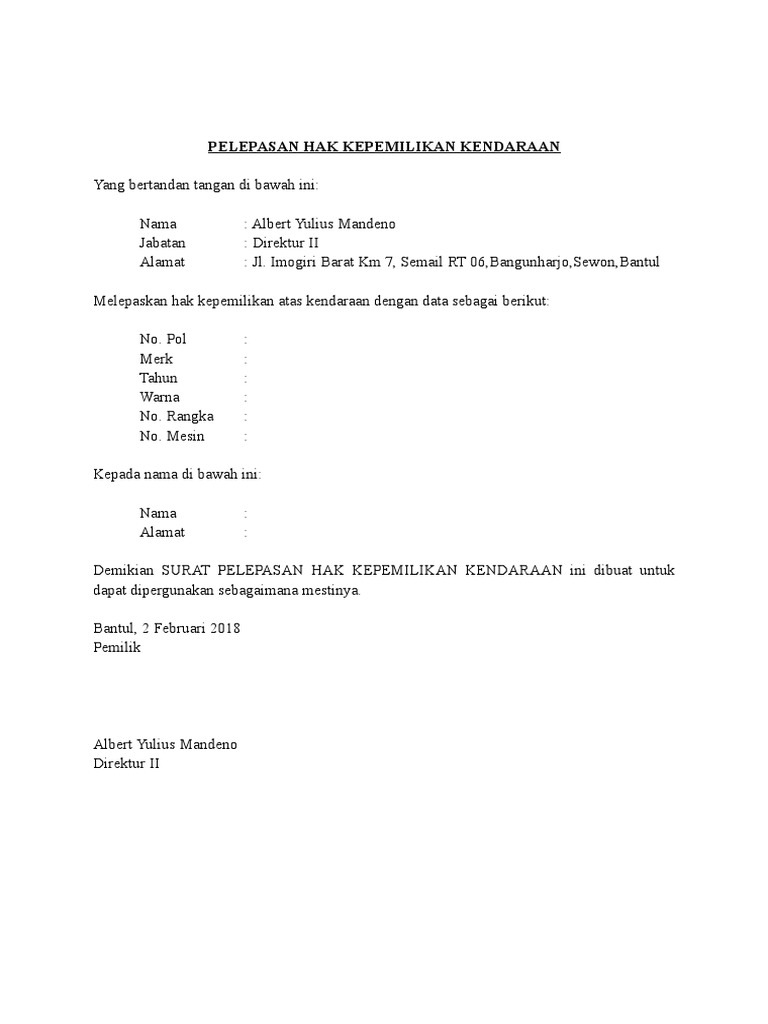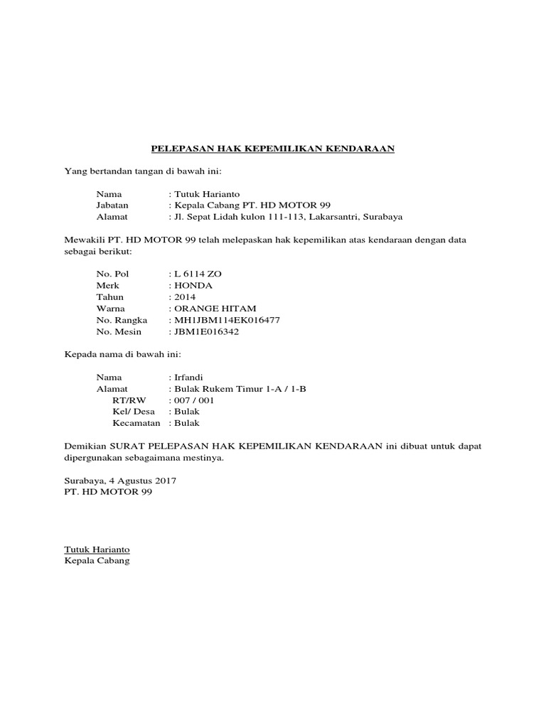 Contoh Surat Pelepasan Hak Atas Kendaraan Bermotor Kumpulan Surat Penting