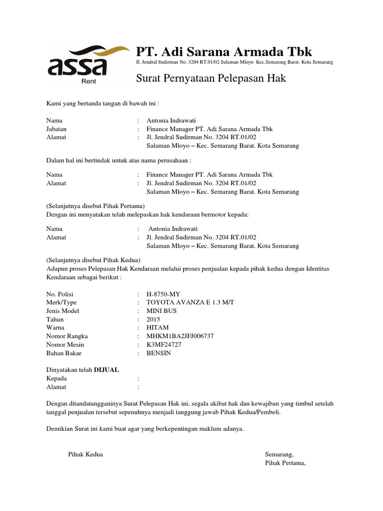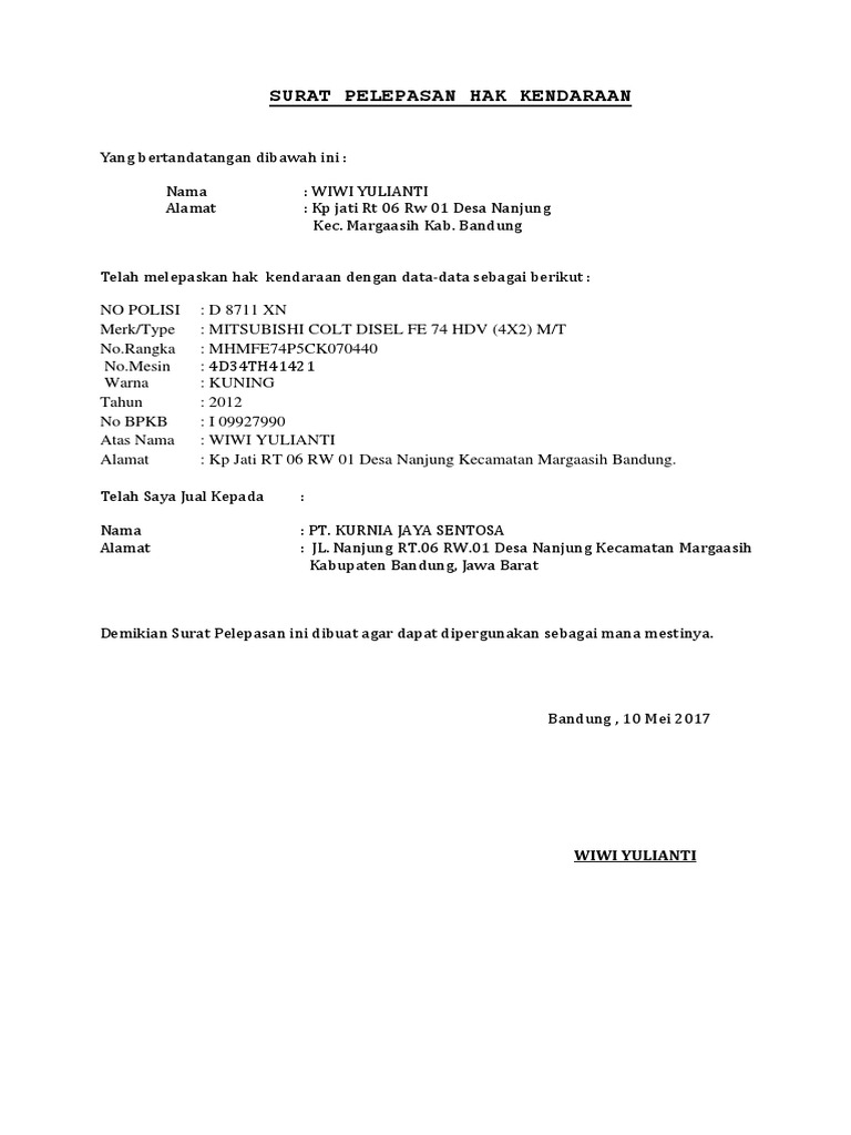 Surat pelepasan hak mobil pt - Mar 08 2021 Telah Kehilangan Surat Pernyataan Pelepasan Hak Atas Tanah Nomor. Penipuan Kedok Over Kredit Mobil Oleh Iman Agus Suherman Kaskus. Contoh surat pelepasan hak jual mobil perusahaan diatas kita misalkan adalah jual beli mobil isuzu panther tahun 2005 sehingga untuk plat nomor kendaraan nomor rangka dan nomor mesin silahkan disesuaikan dengan mobil yang akan diperjualbelikan dan untuk branch manager pt lamapedia kita misalkan adalah bapak rafli.