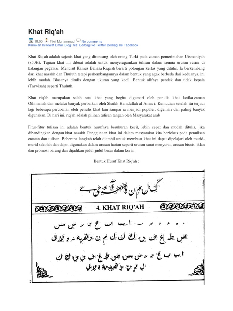 Posisi khat Riqah berada di antara khat Diwani dan khat Siyaqat di mana Mumtaz Bek sangat masyhur dengan keahliannya di. Khoth atau khat riqah merupakan salahsatu jenis khat arab yang dengannya kita bisa bisa menulis tulisan arab secara cepat ringkas dan rapi sesuai dengan kaidah-kaidah penulisannya. Browse by popularity category or alphabetical listing.